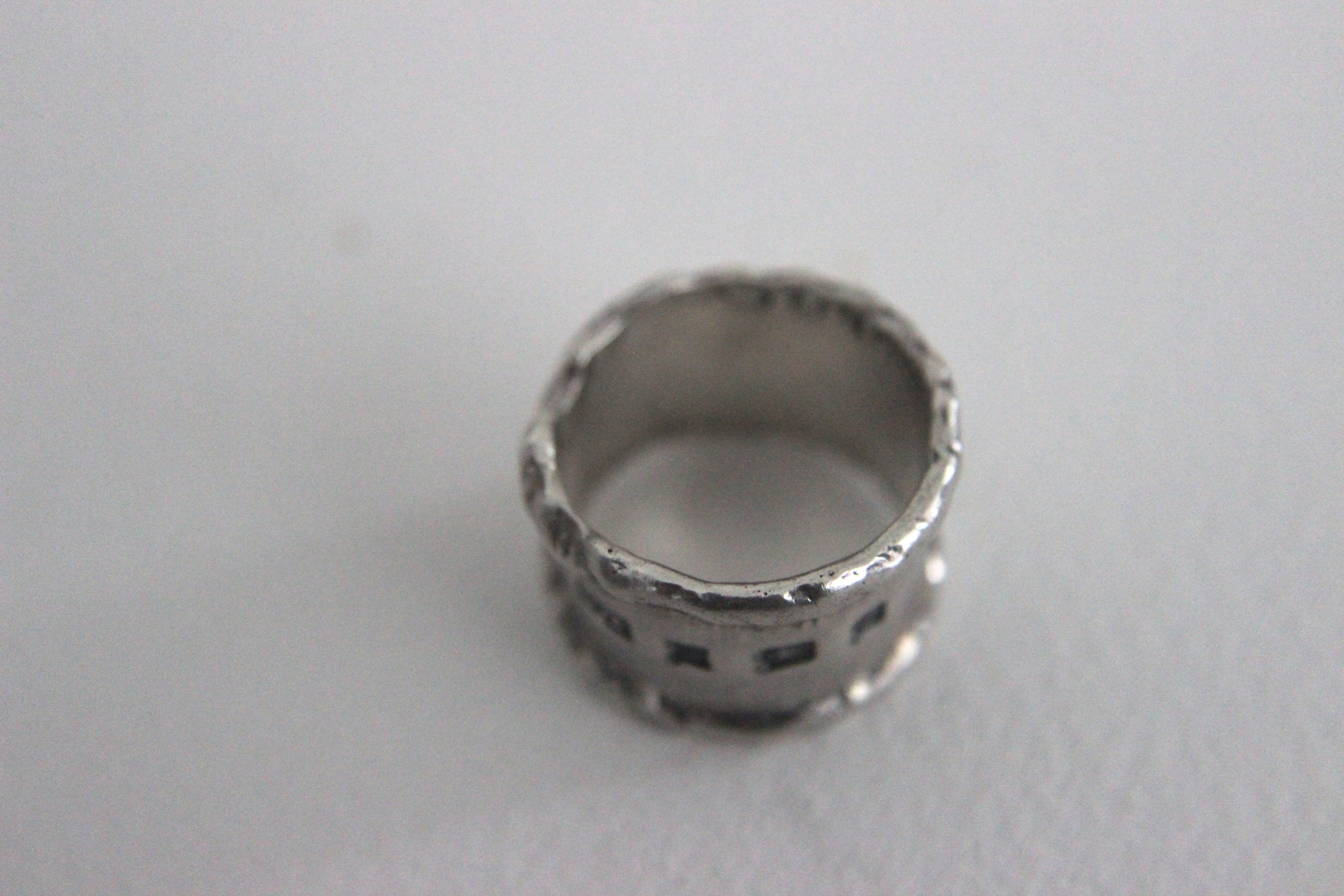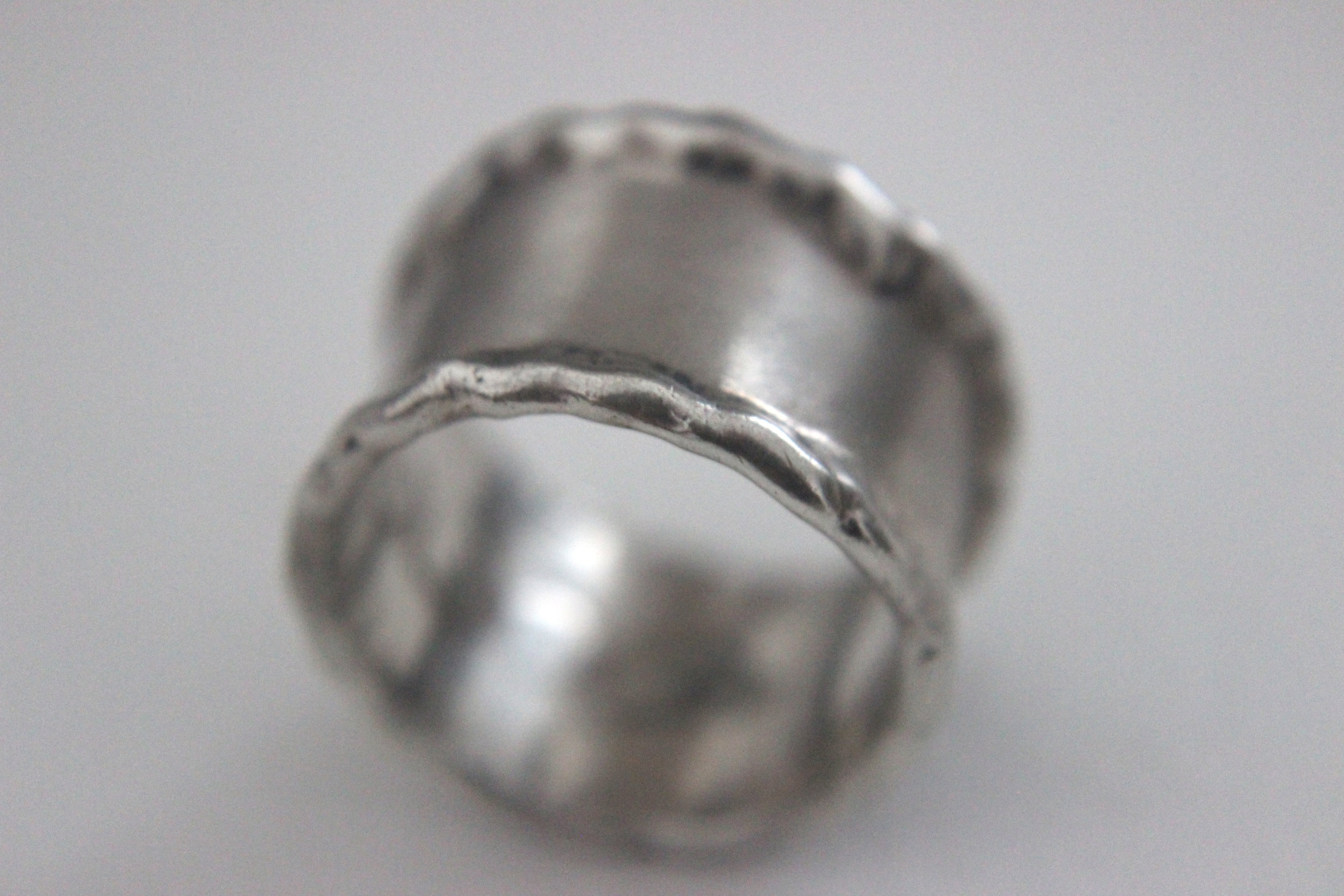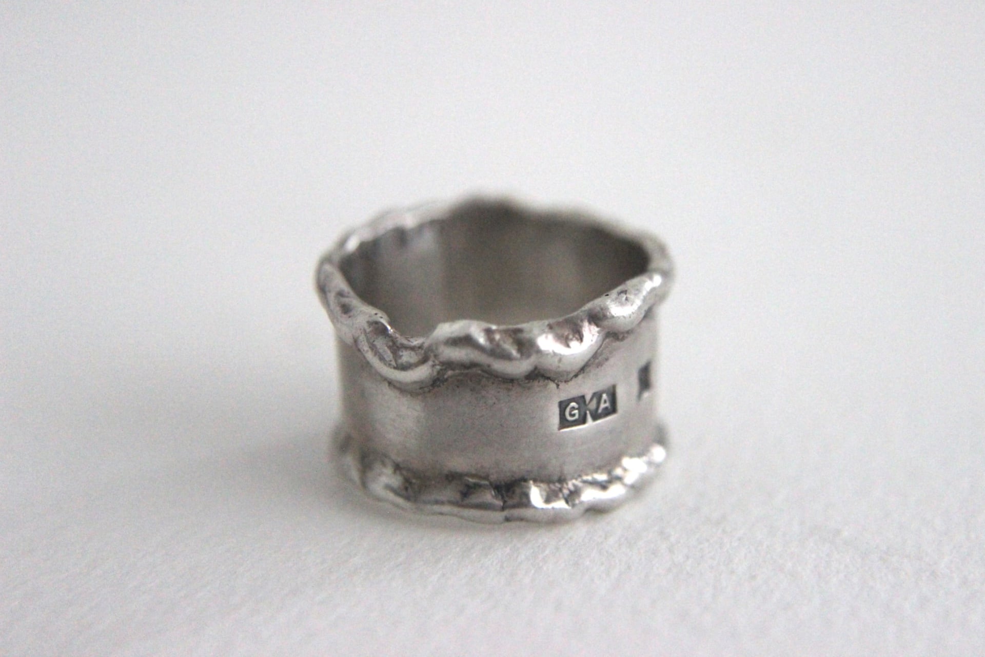 波打つ縁と幅広のプレート状デザインの有機的で少し無骨な印象のリングです。