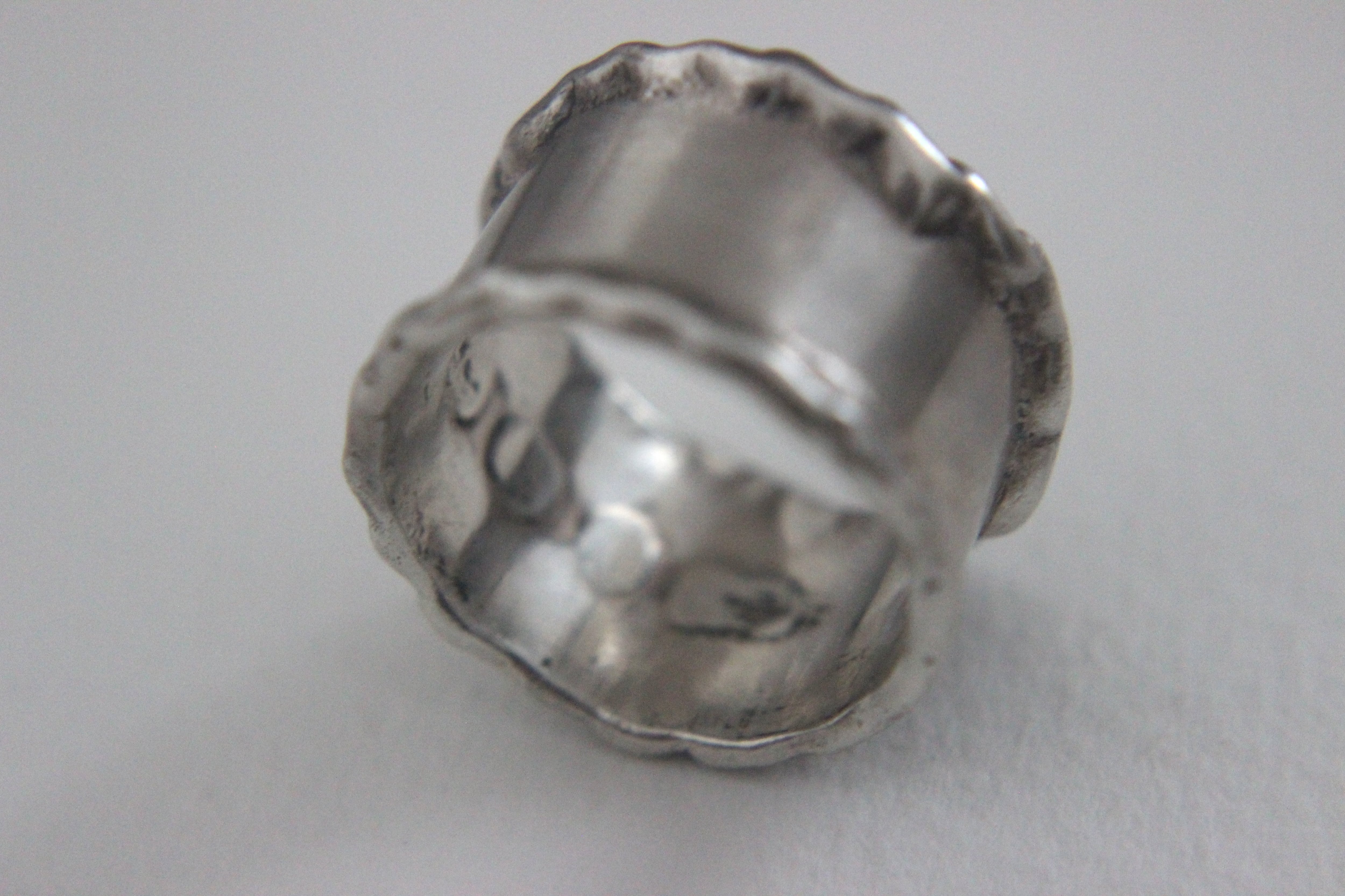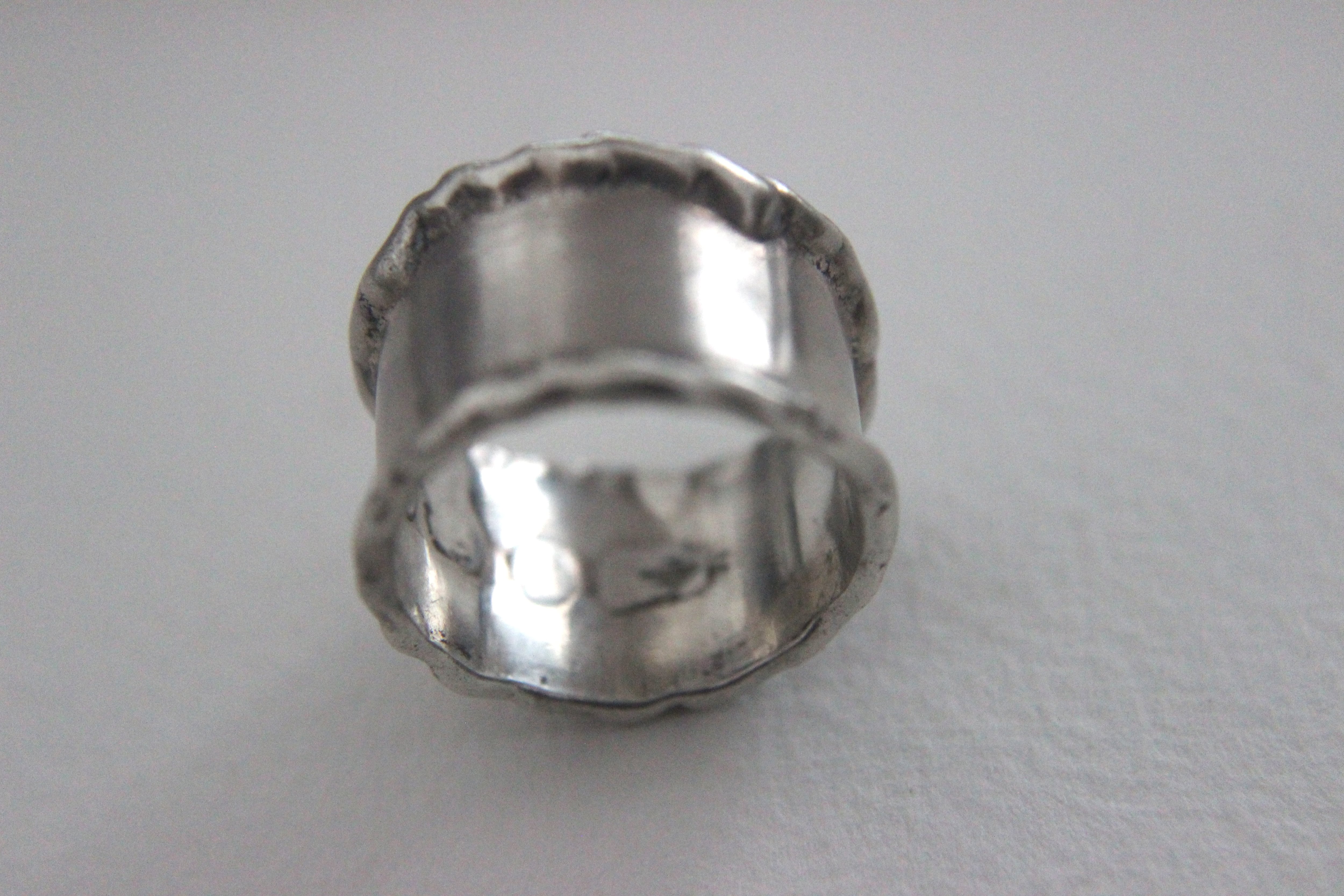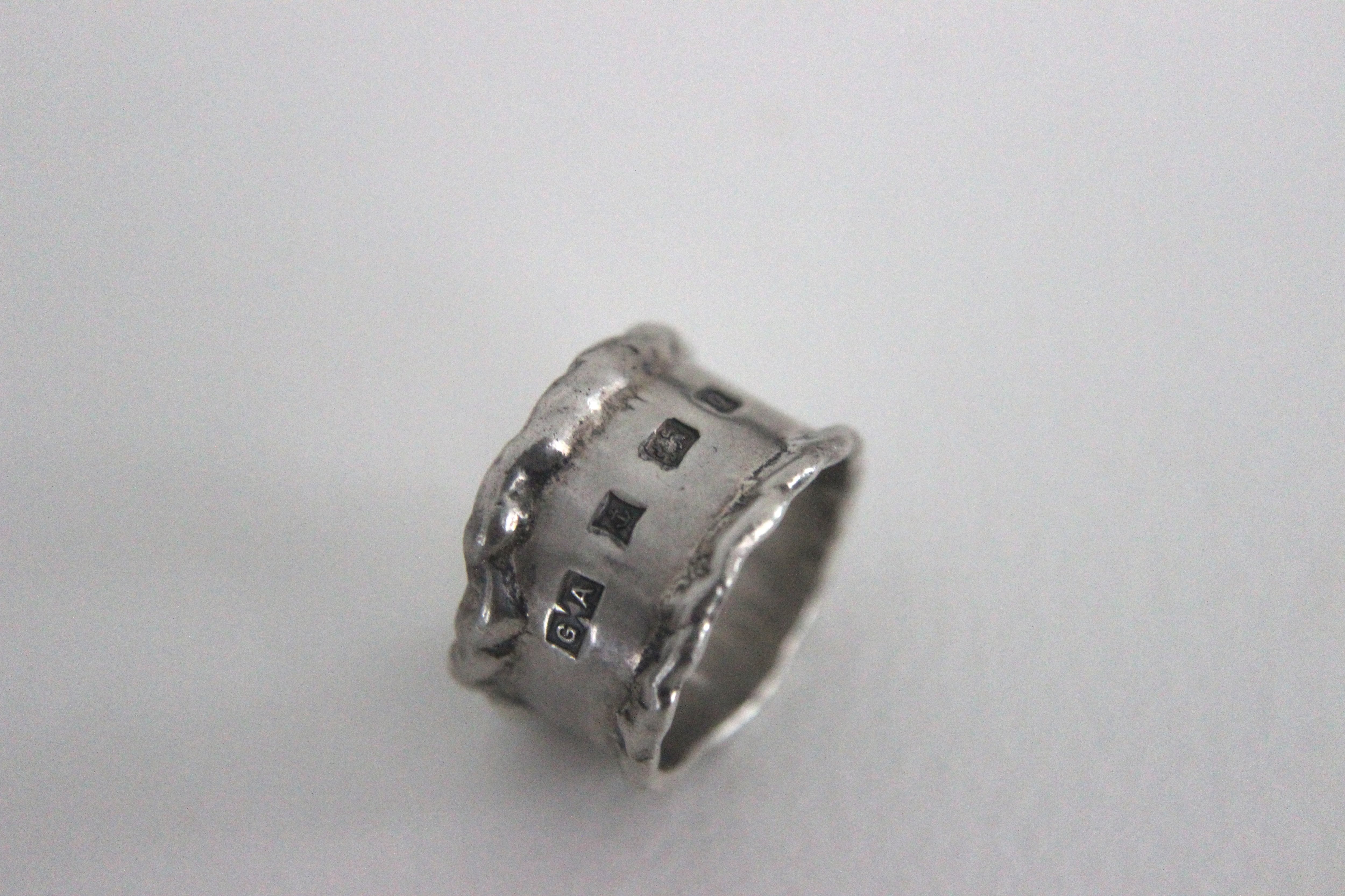 波打つ縁と幅広のプレート状デザインの有機的で少し無骨な印象のリングです。