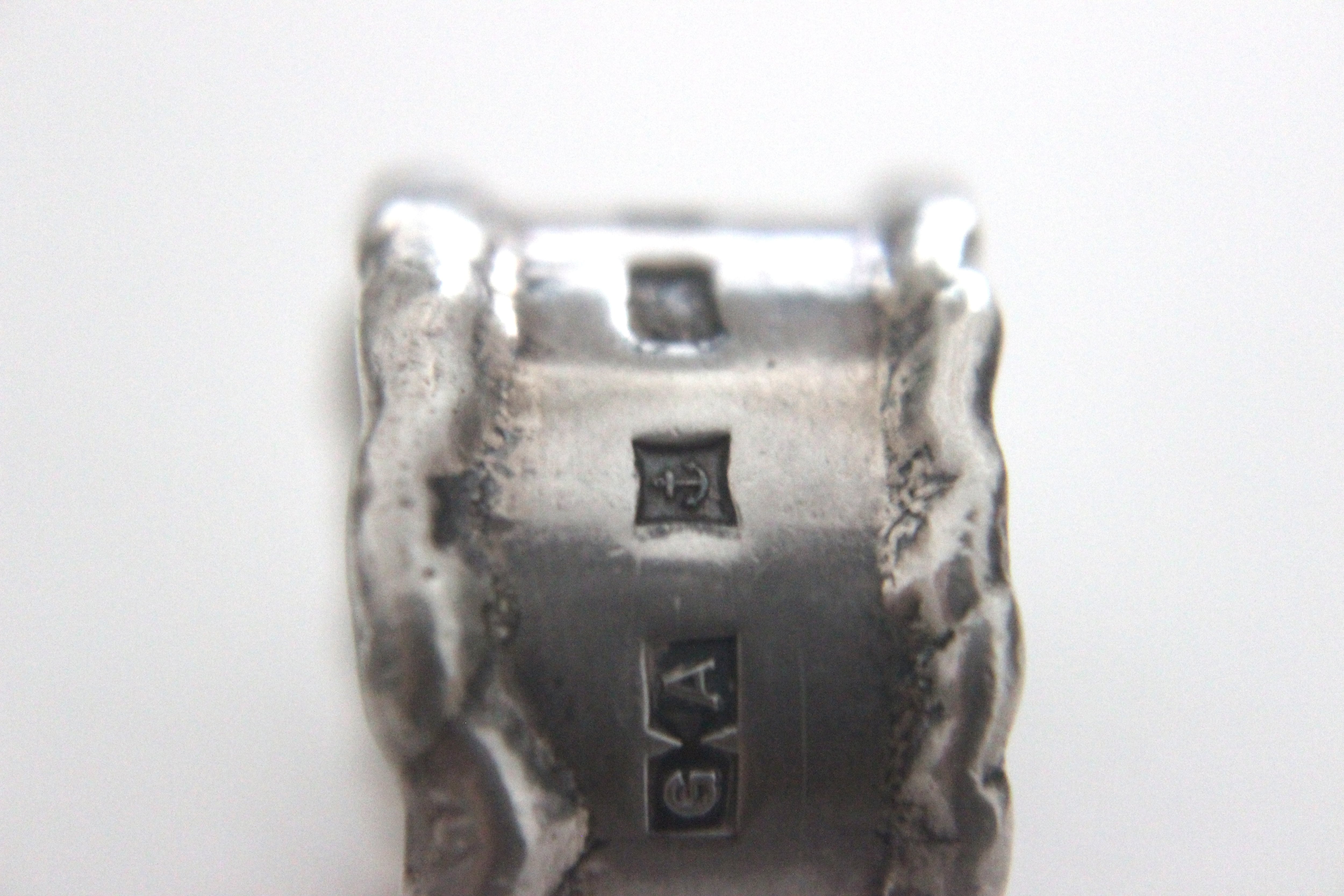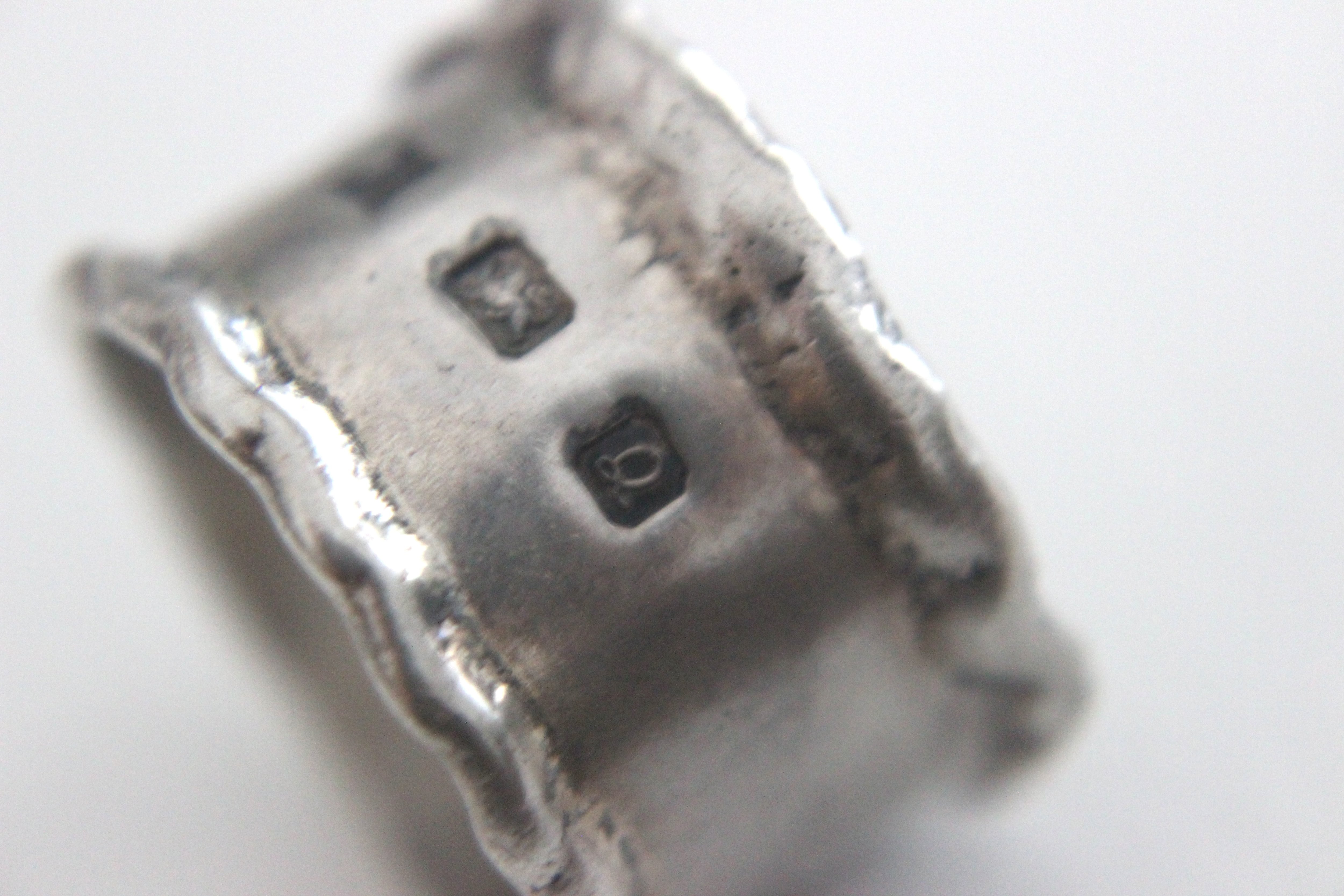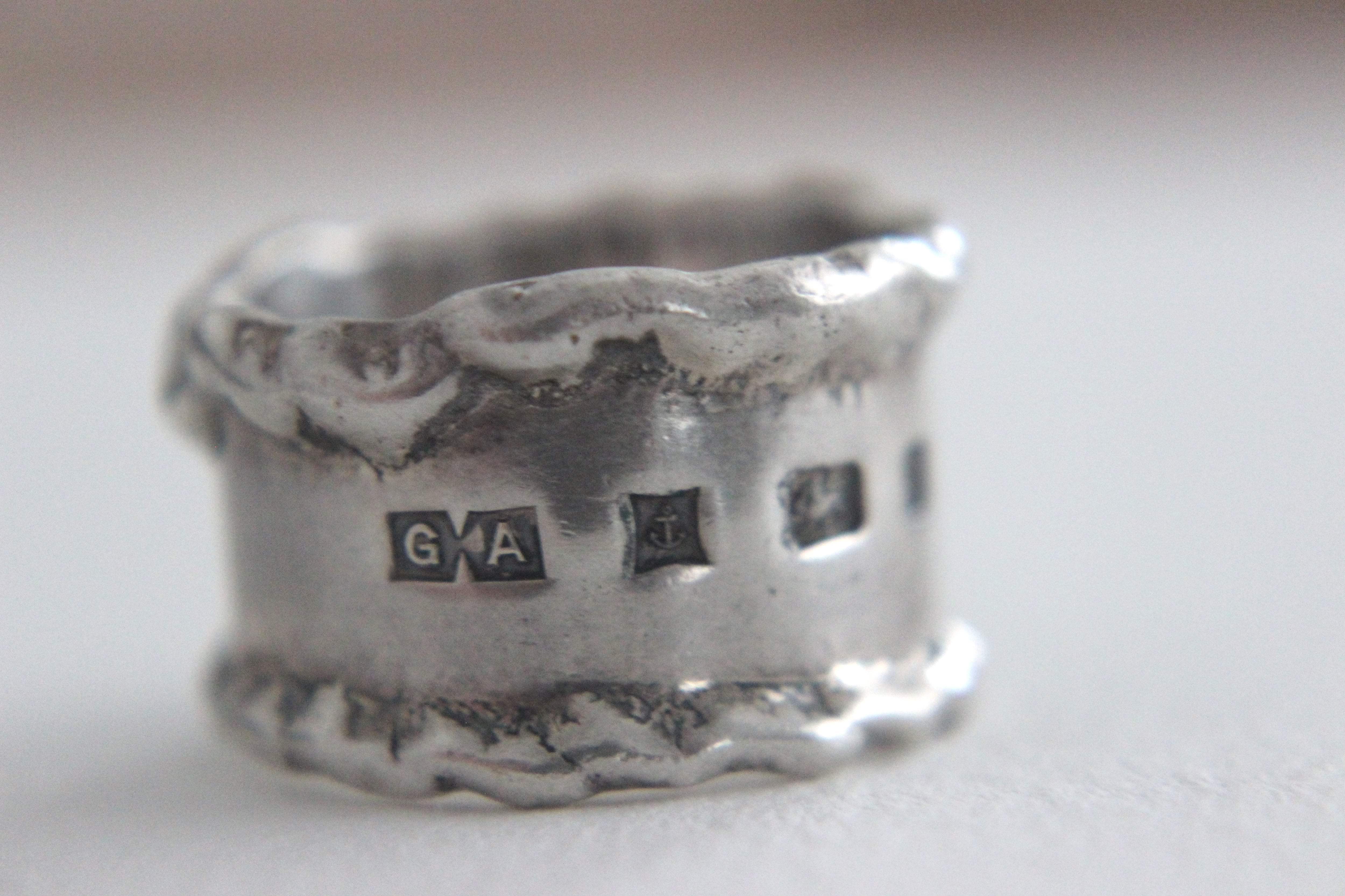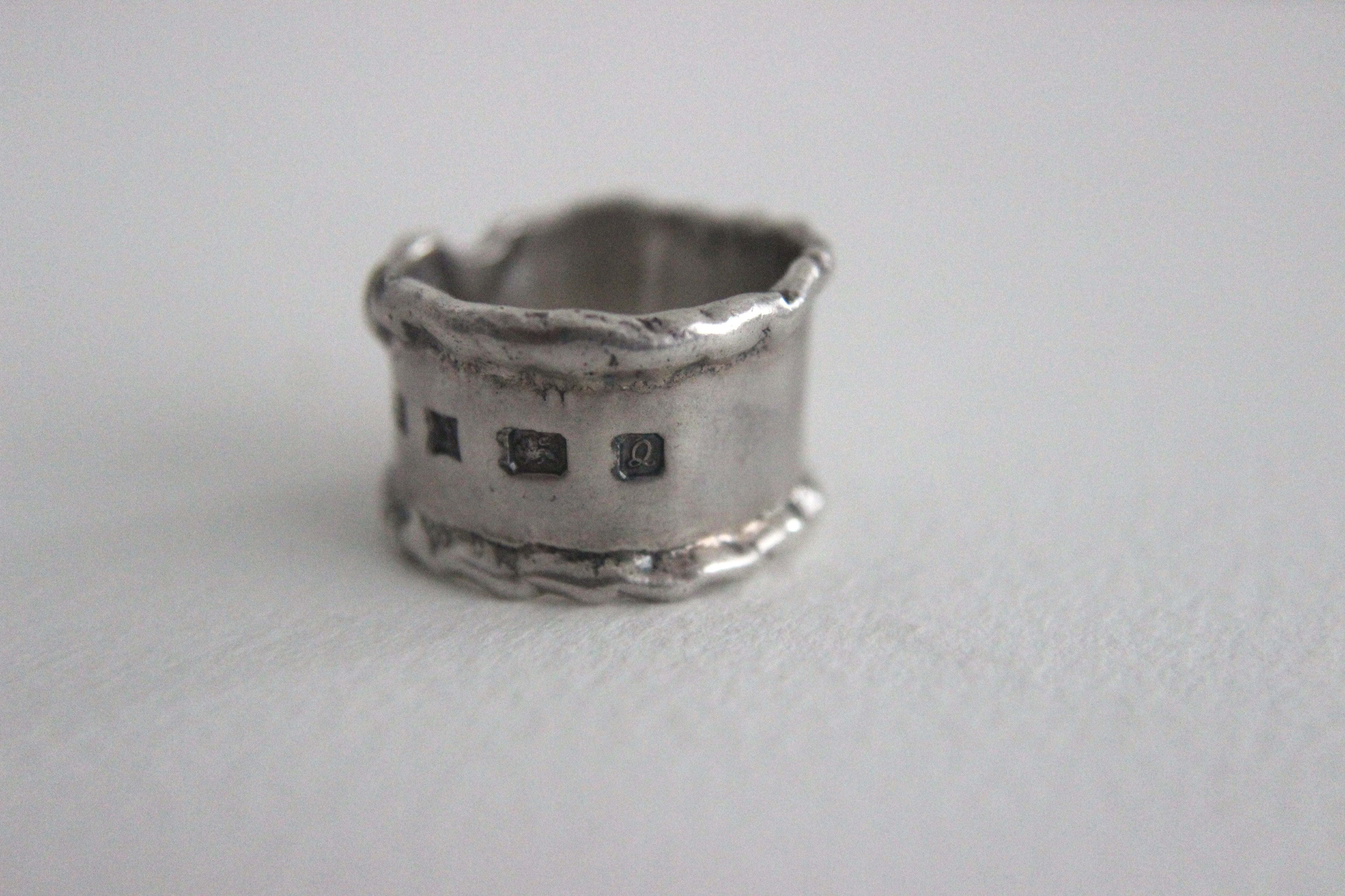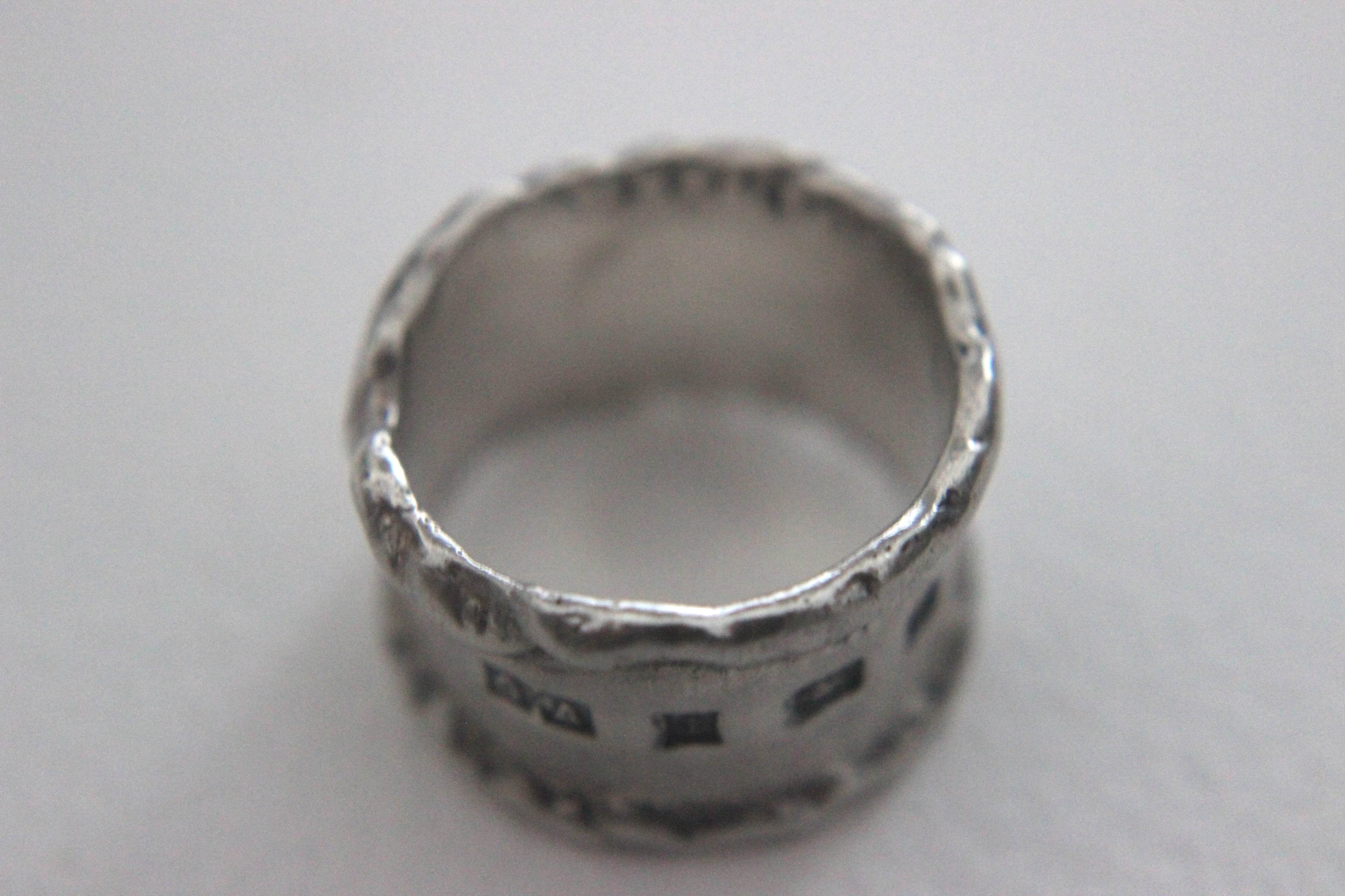 リングの表面にイギリスの伝統的なホールマーク(貴金属の純度証明)がデザインの一部として大きく刻まれています。