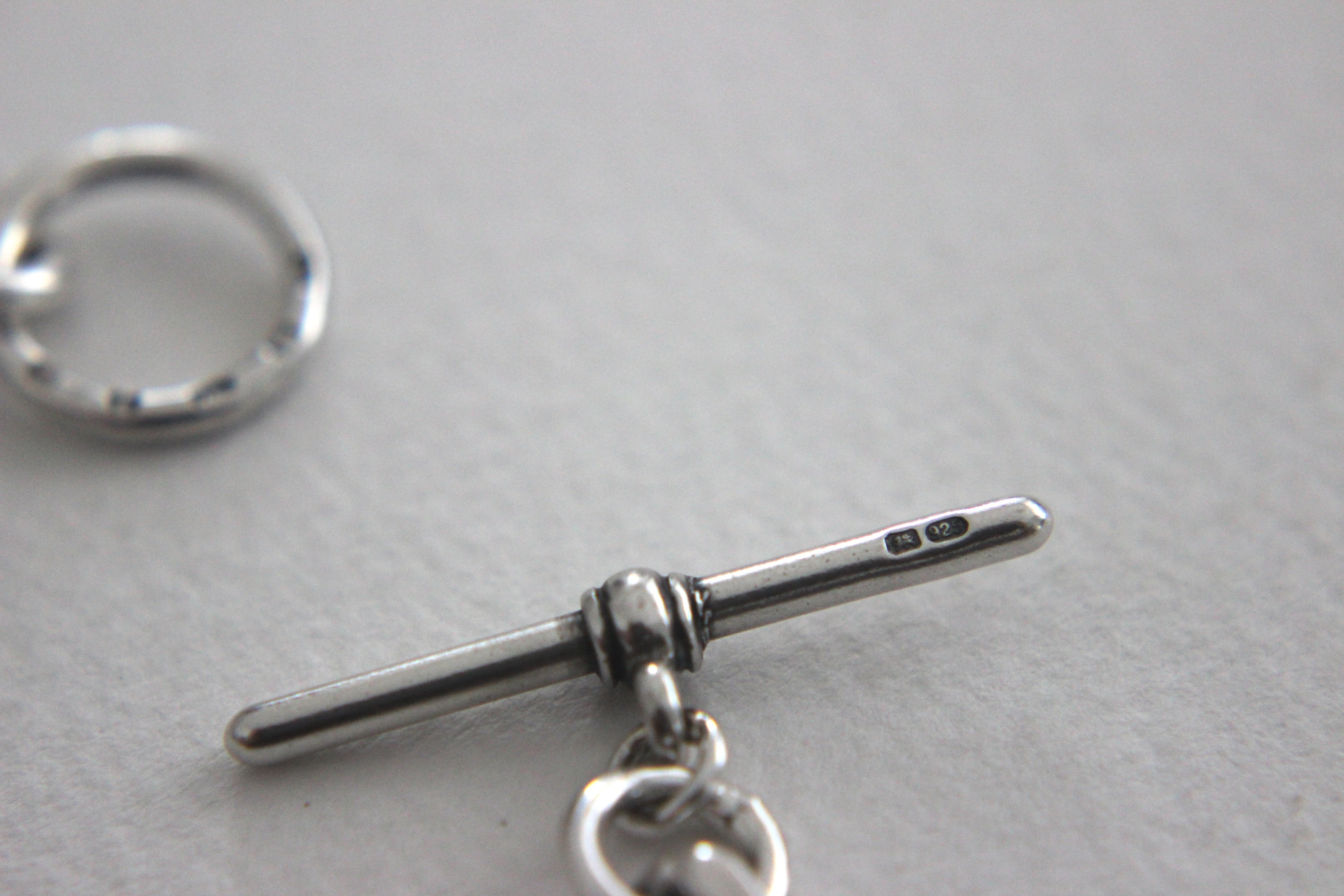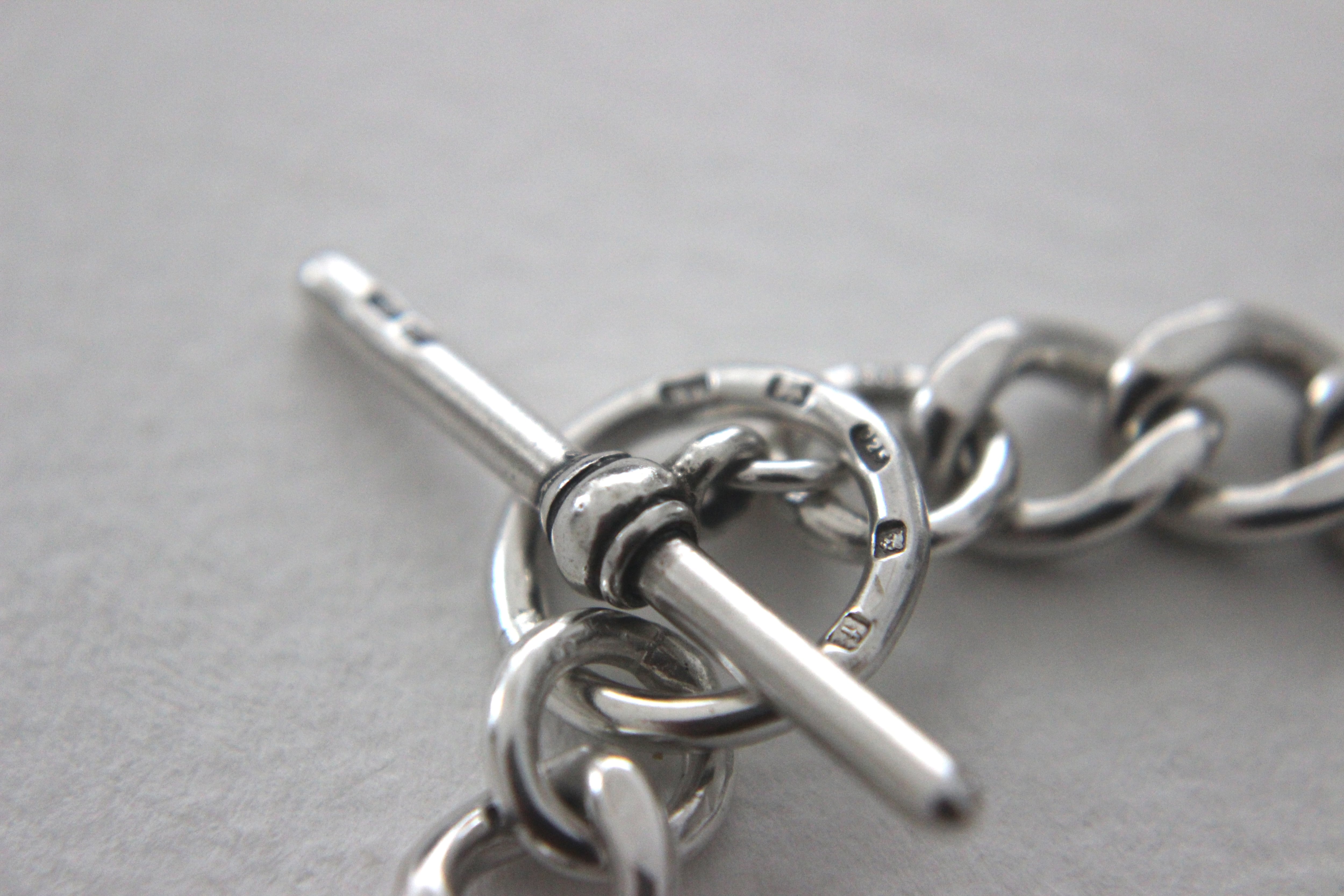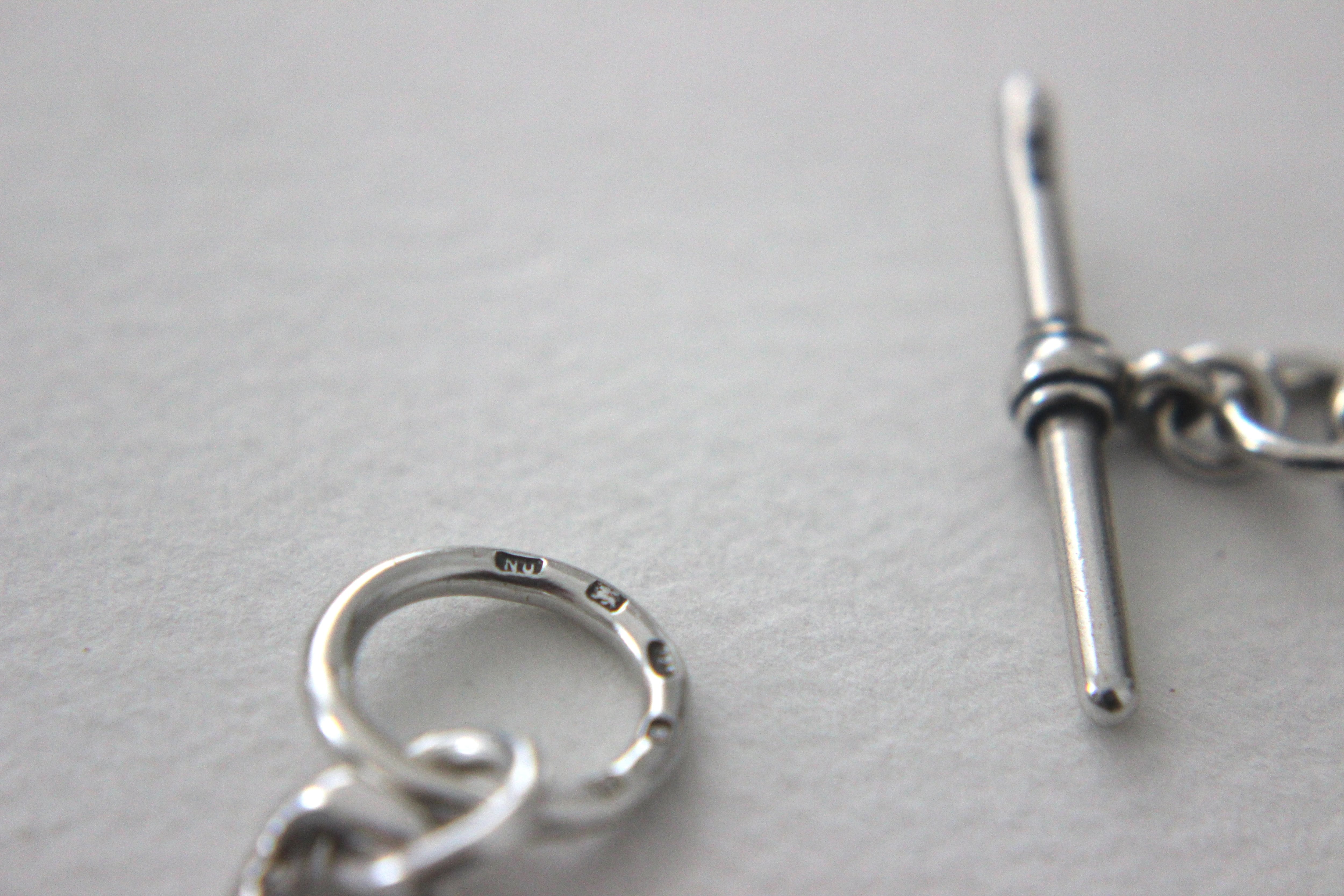 Tバーや丸カン、そして一見気づかないようなチェーンのコマひとつひとつの隠れた箇所にまで、小さなシルバーのホールマークが刻印されています。