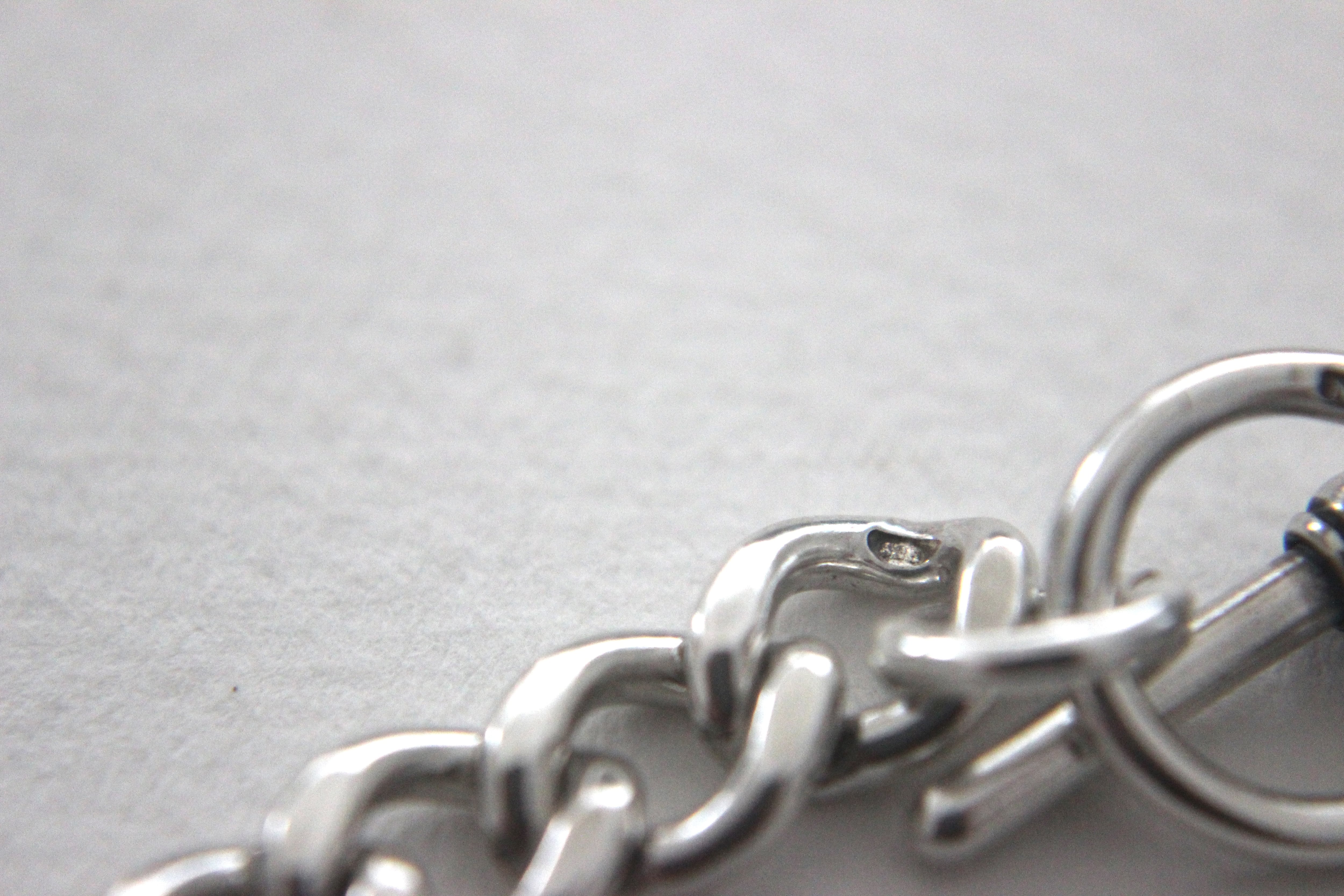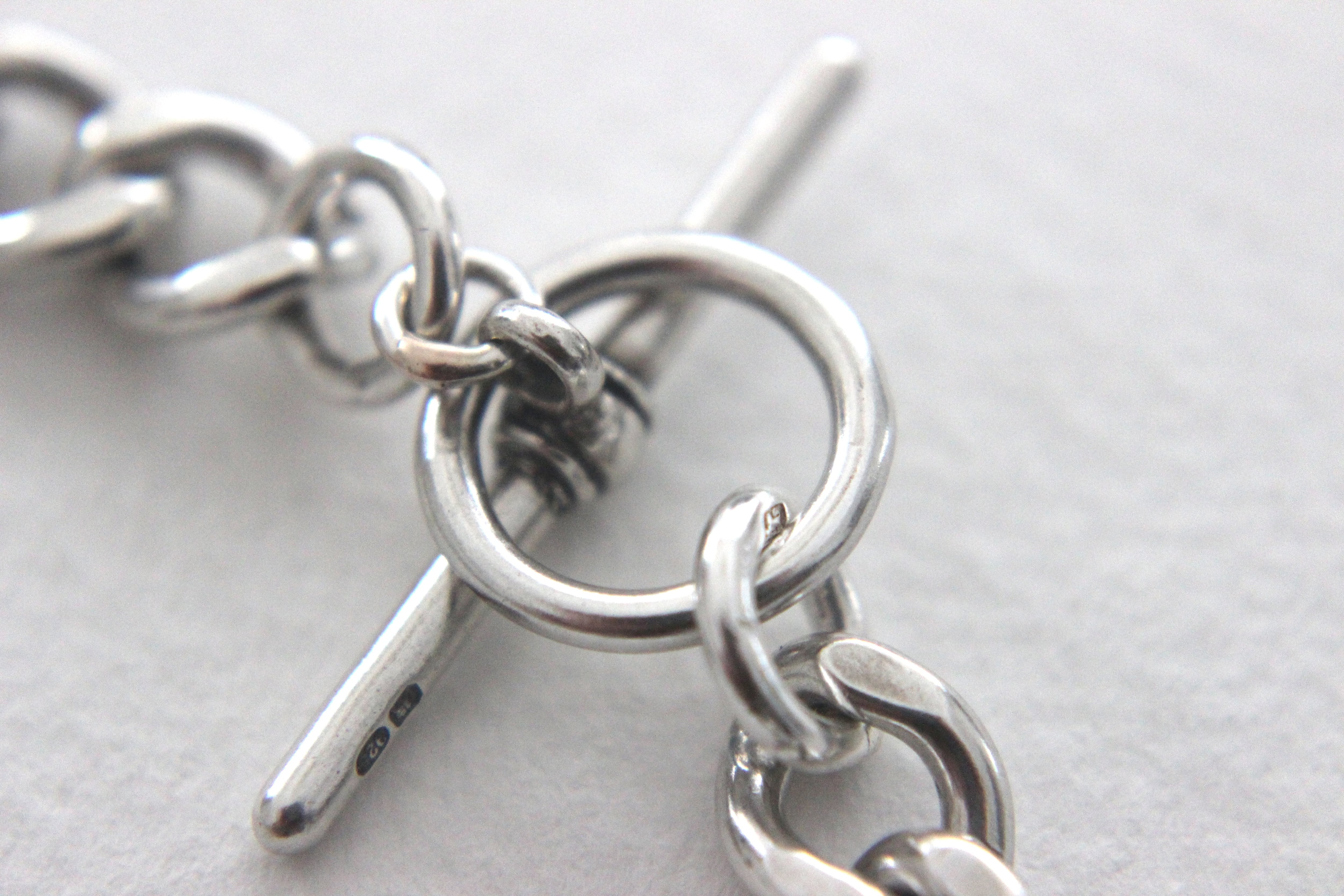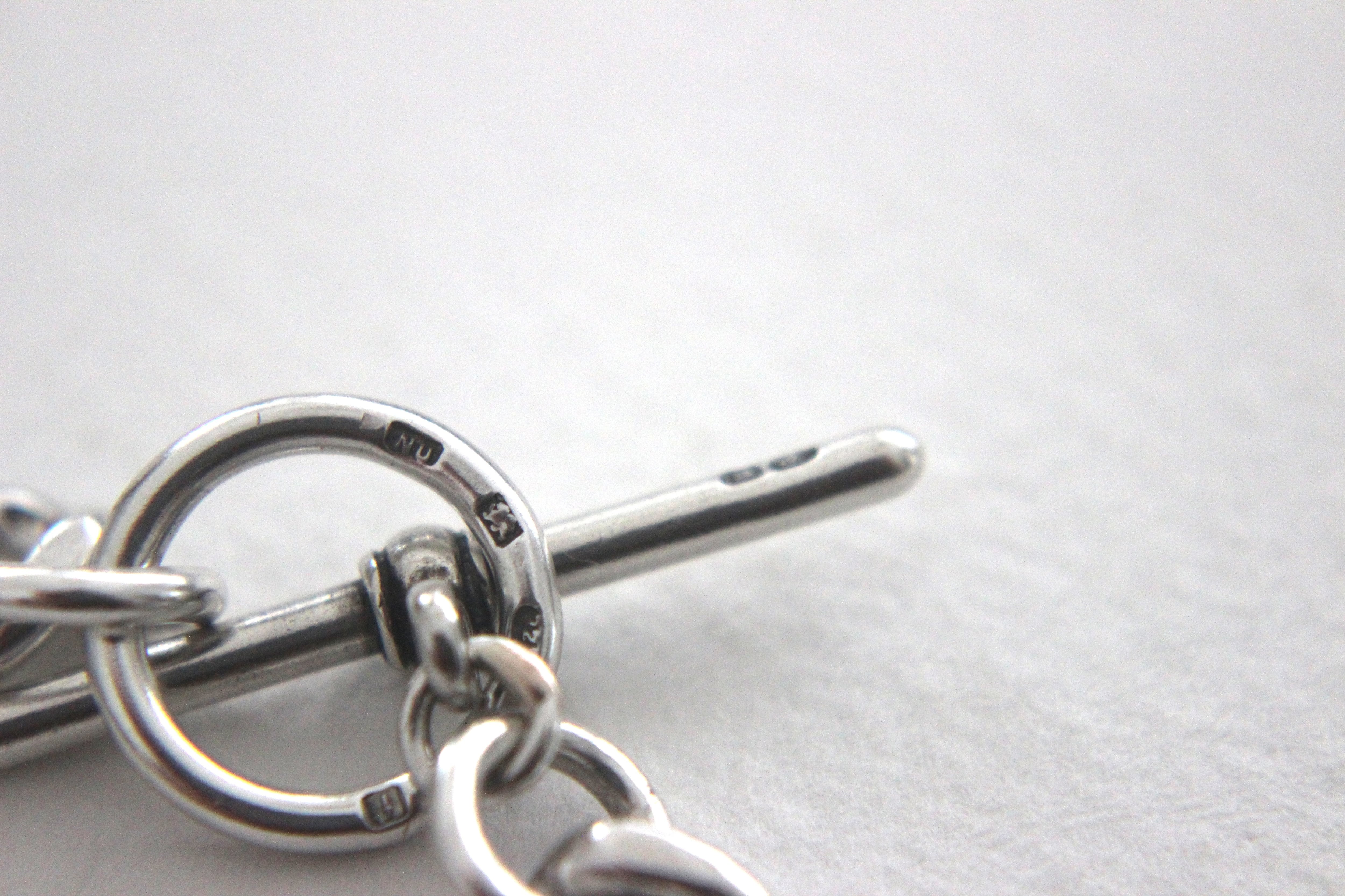 Tバーや丸カン、そして一見気づかないようなチェーンのコマひとつひとつの隠れた箇所にまで、小さなシルバーのホールマークが刻印されています。